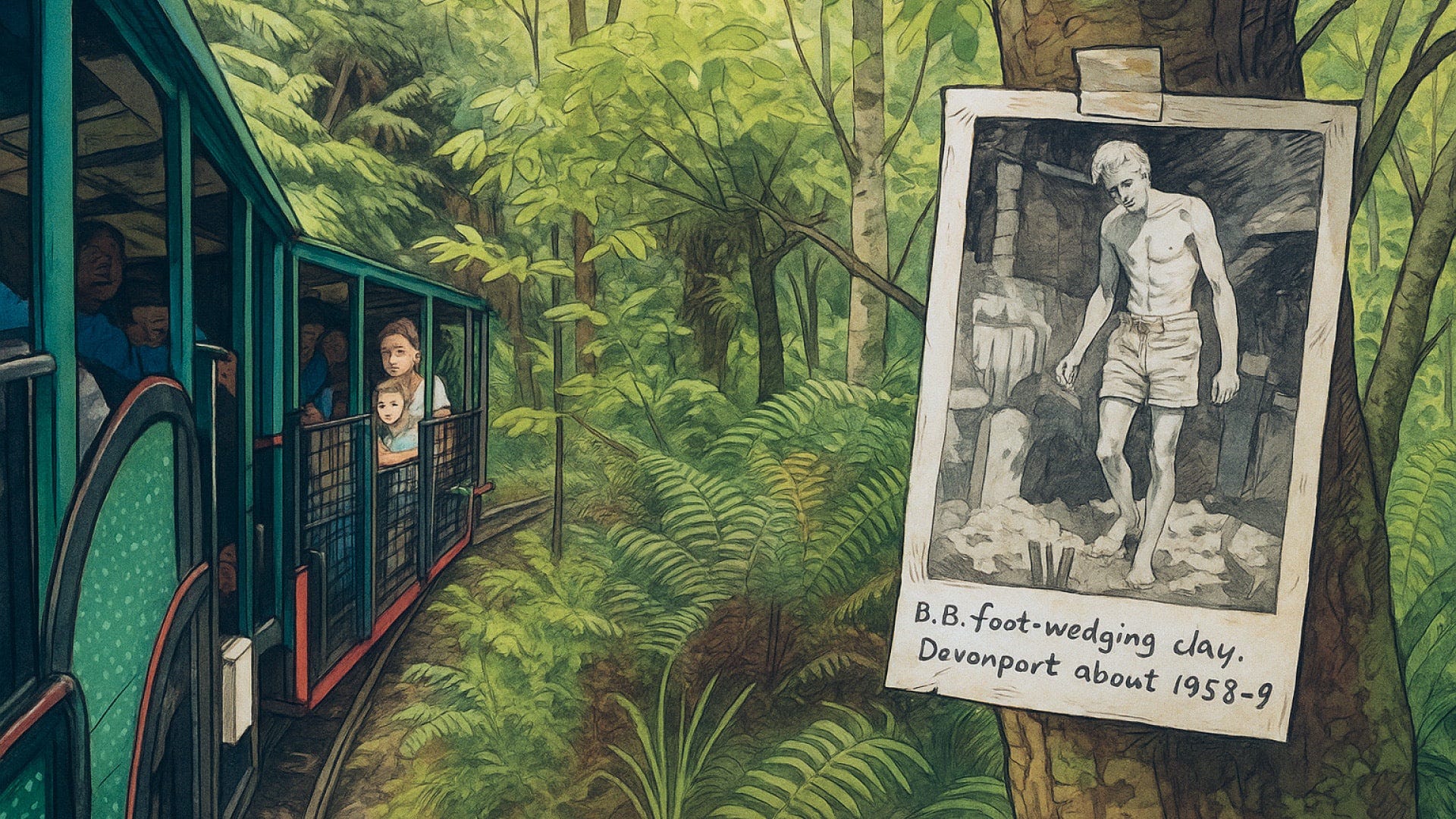 照片主角 Barry Brickell 曾是高中理科老师,只教了一个学期就辞职去挖黏土。随后四十年,他亲手砌窑、复绿山坡,还铺下 3 公里 15 英寸窄轨,把 3 万名游客一年送上 “EyeFull Tower”。