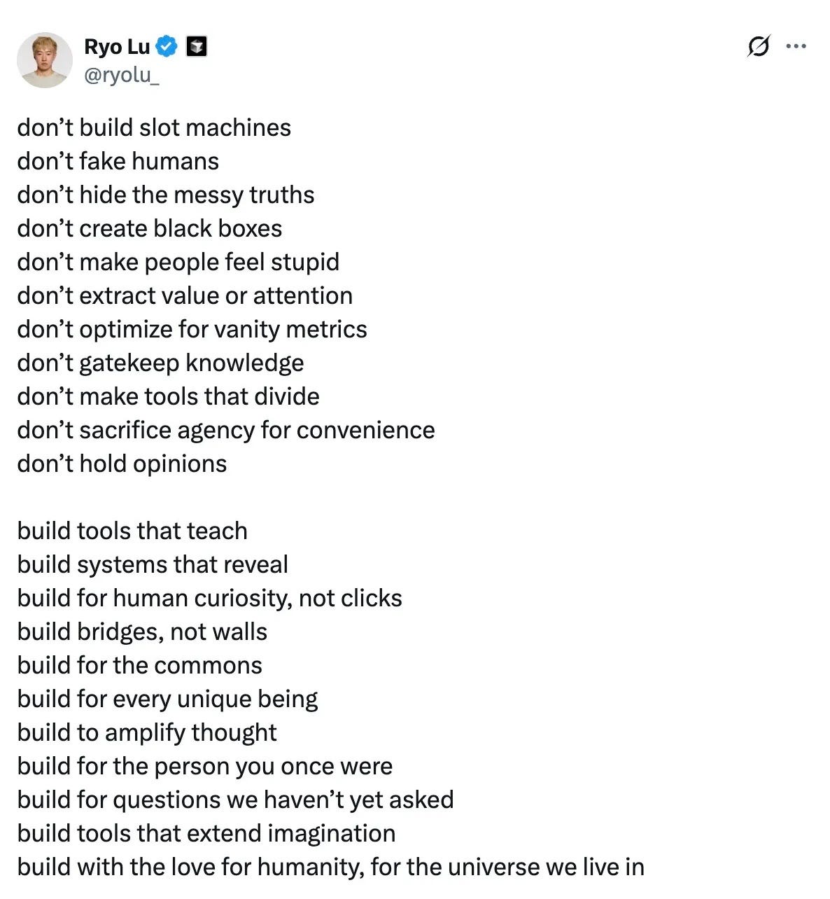 Cursor首席设计师 Ryo Lu 在 X 上发了一段很像“AI 时代新设计师宣言”的话,虽然每条都只有短短几个词,但背后的价值观很清晰: