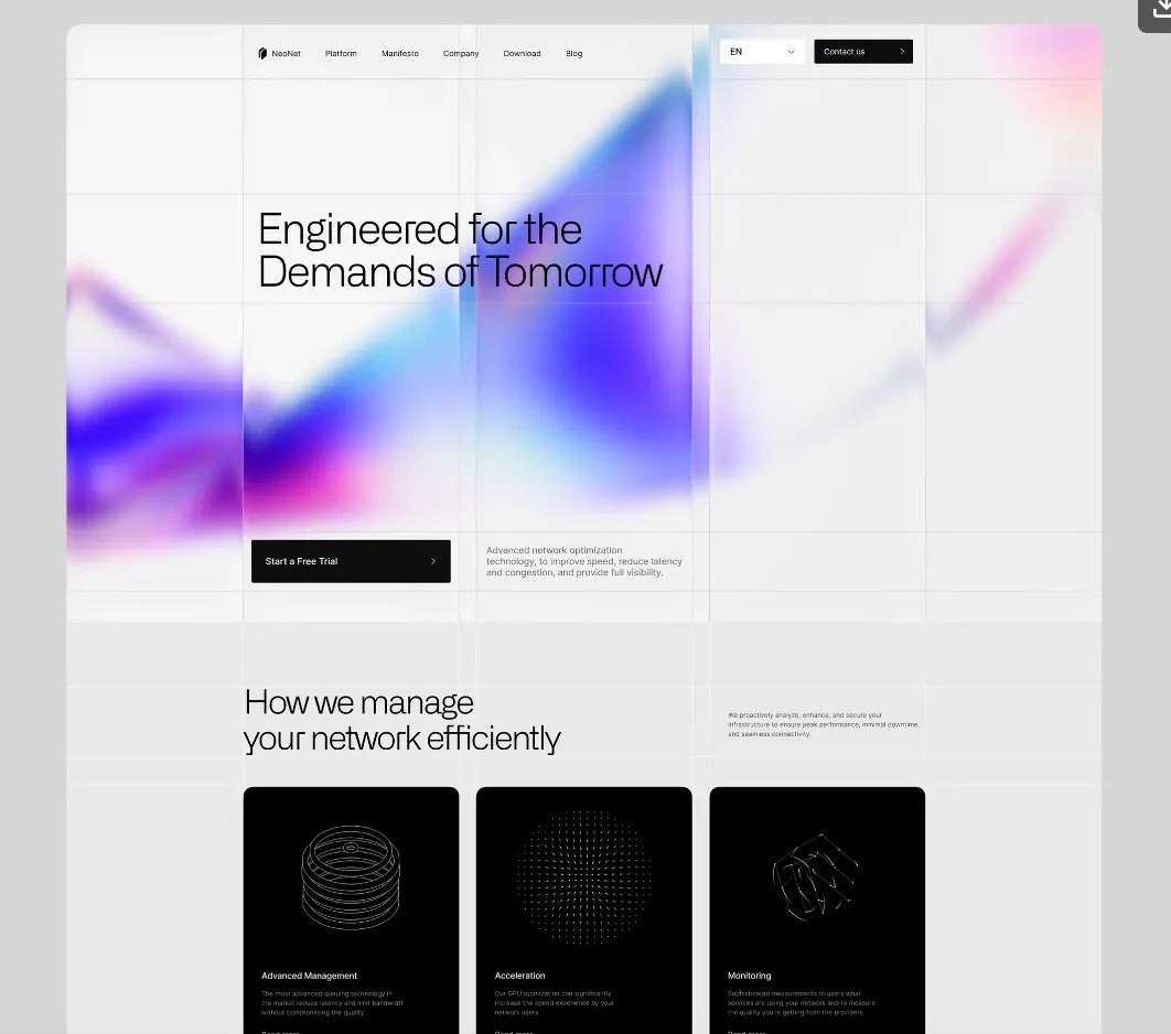 这个设计的亮点在于 Hero 区域的处理——背景用了抽象的动态图,加上模糊和玻璃质感的透明效果,瞬间拉满了精致感和未来感。乍一看很高级,但思路并不复杂,只是玻璃效果可能需要通过代码实现,才能既保证视觉质感又保持性能。