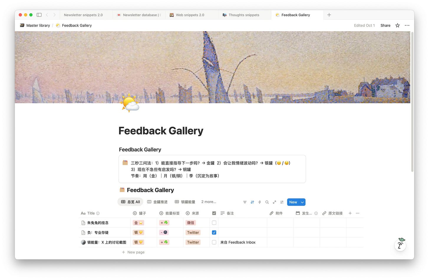 想到这一点,是因为最近在社媒上看到一些评论,其中有少量人身攻击。作为玩自媒体多年的老鸟,早就有应对方式,但还是会有那么一瞬间被刺到。昨天散步时,我和 ChatGPT 深聊了一会儿,找到了一些心理上的原因,对自己也多了一些了解。于是我在 Notion 里创建了一个”反馈图书馆”。