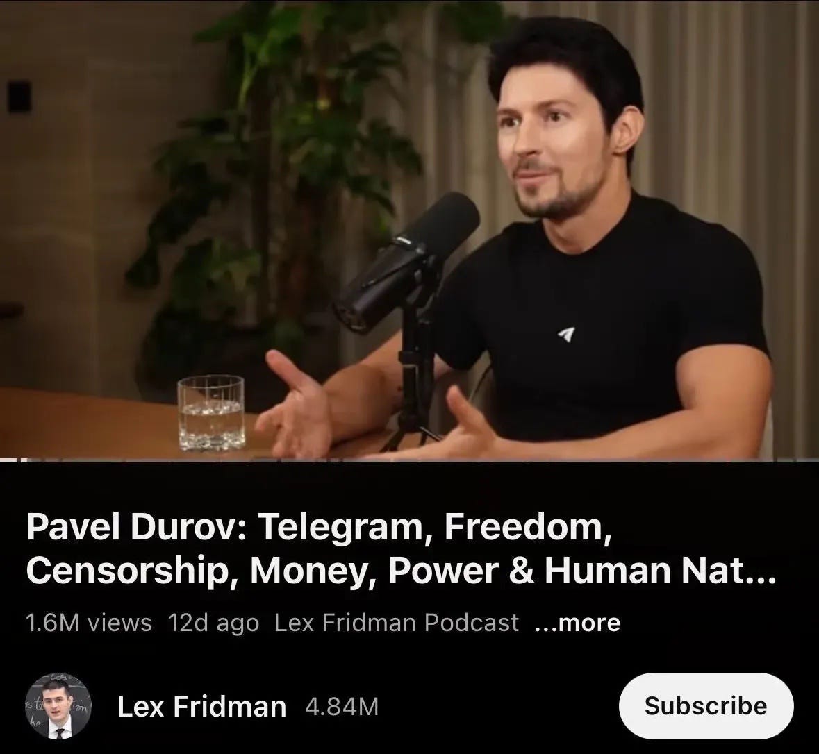 开始看 Telegram 创始人 Pavel Durov 的采访。这个哥们个人气质太好了:除了因为智慧与财富加持的英俊相貌(哥们植过发)和健美身材(每天300个俯卧撑,一周健身5次)之外,我特别留意了他的沟通表达方式。